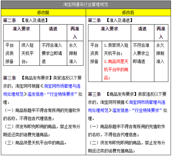 主要变更内容为新增商品资质要求。修改后的规范要求,1.卖家须入驻天机平台;2.商品须是天机平台中的商品。