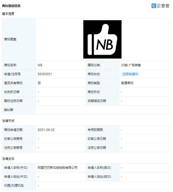 A5创业网(公众号:iadmin5)10月15日报道:近日阿里巴巴新加坡控股有限公司申请注册 NB 商标,商标国际分类涉 35 类广告销售,企查查 App 显示,商标图案为点赞手势外加字母 NB,目前商标状态为注册申请中。