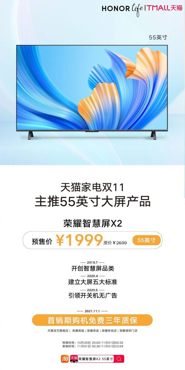 作为新近登场的新品,荣耀智慧屏X2 43英寸售价为售价1799元,55英寸售价2699元,65英寸售价3499元。10月18日正式官宣首销价格,荣耀智慧屏X2 65英寸版本为2699元,荣耀智慧屏X2 55英寸版本为1999元,非常超值。同时在即将到来的双11,荣耀智慧屏X2 65英寸成为了京东双11战略级电视新品,55英寸则成为了天猫家电双11主推单品,产品力已经获得了两大电商平台的背书认可。如果你最近想要购买一款智能大屏,或者想尝试智能家居的便捷体验,不妨多关注关注这款各方面都出色的高品质大屏。