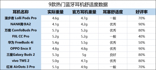 佩戴舒适度一般的是:万魔 ComfoBuds Pro、三星Galaxy Buds 2、漫步者 Lolli Pods Pro、红米 AirDots 3 Pro