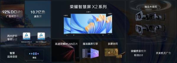 工欲善其事必先利其器,除了没有开关机广告,荣耀智慧屏的其他功能和特性也同样强大。10.7亿色广色域全彩屏,具有高色深和92% DCI-P3广色域的显示优势,结合全面屏设计实现了色彩丰富、层次鲜明的沉浸观感;针对看大片和音乐会现场场景。荣耀智慧屏X2 65/55英寸采用了2*10W扬声器,独立大音腔设计,整体表现高音透亮清澈、低音下潜有力,加上专业音效算法调优,能带给用户环绕沉浸的“家庭影院级”享受;此外,荣耀智慧屏X2获得了德国莱茵无频闪和低蓝光护眼认证,全程采用DC调光,有助于缓解长期观看造成的用眼疲劳,对老人和小孩更加友好;同时还支持自研Cast+投屏协议,可与手机、平板、笔记本等多设备协同,将原本的大屏定位由影音拓展到游戏娱乐、办公会话、平面创作等复合场景,满足用户的多元化需求。