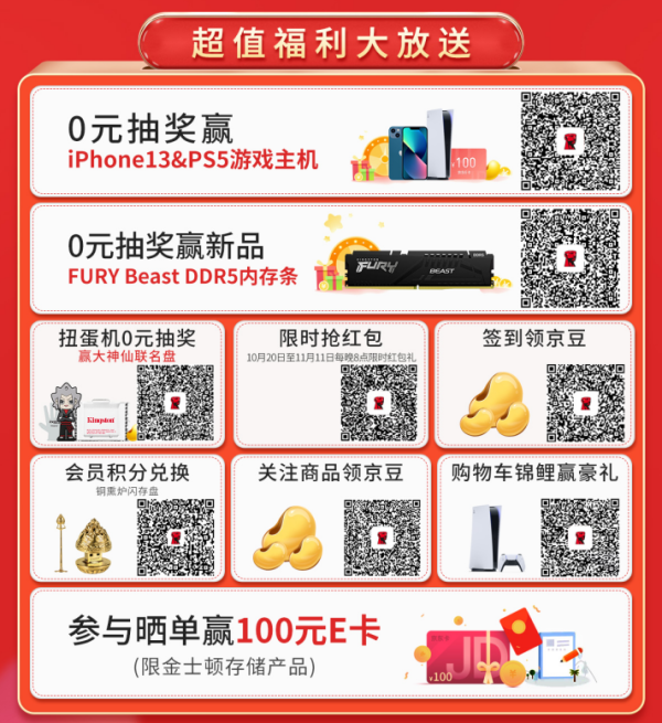 金士顿京东11.11期间活动多,羊毛多,不仅各类存储产品有全年冰点价,还有0元抽大奖,5折神券、京豆领不停,年终大促过时不候!还不抓紧时间加入金士顿会员,心仪产品等您带回家!11.11大促全年仅此一次,错过后悔等明年!