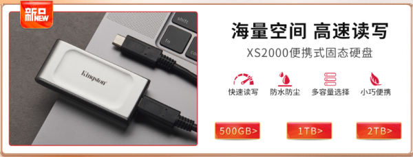 颠覆性的金士顿XS2000移动固态硬盘的体积只有69.54 x 32.58 x 13.5 mm,重量更只有28.9g,便携性丝毫不输闪存盘,搭配可移除的橡胶保护套能达到IP55防水等级,防水、防尘、防震的品质可以从容应对苛刻的使用环境。在采用USB 3.2 Gen2 x 2标准接口后,其性能大幅提升,读写速度高达2000MB/s,大大超过现有闪存盘以及绝大多数固态硬盘,并且容量有500GB、1TB、2TB三种规格可选,充分满足各种个性化存储需求。
