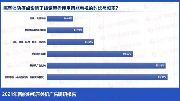《报告》显示,只有10%的被访者智能电视不含开关机广告。其余90%的被访者中,广告时长低于30秒的占16%,超过30秒的占33%,超过1分钟的占18%;同时,超七成用户表示对开机广告一秒都不能忍 ,超八成用户是在使用时才发现电视有开关机广告,不含一键取消/关闭开机广告功能设置的情况高达86%,而这也是消费者无法关闭开关机广告的重要原因。正如赵明所说,“存在的不一定是合理的,产品到底好不好,消费者最有话语权。”