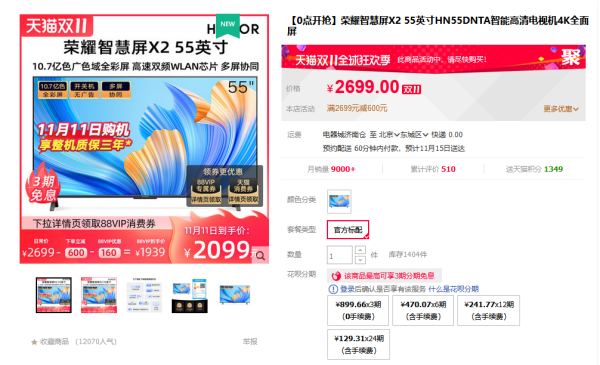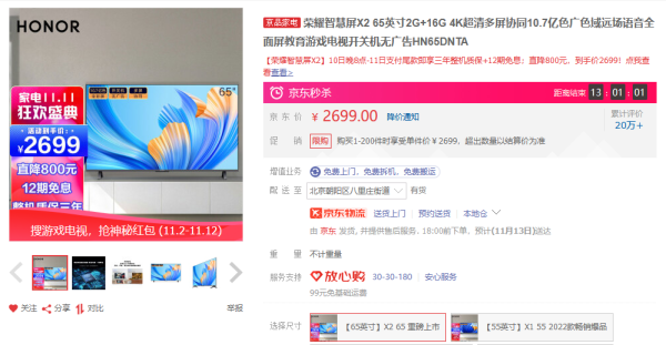 凭借“开关机无广告”的标杆理念、出色的产品力和超值优惠的价格,荣耀智慧屏X2自诞生以来受到市场和消费者的赞誉不断,其中荣耀智慧屏X2 65英寸的单品销量和销售额就一举斩获了京东家电开门红双冠军。今日双十一,京东和天猫平台优惠价继续,65英寸只要2699元(京东),55英寸仅需1999元(天猫,可叠加平台券),最重要的是,今天购机还享受三年整机质保服务。如此好看好玩好用的产品,快趁着今天下单吧!