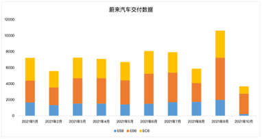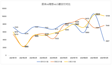 然而事实却不尽如人意。从10月交付数据来看,蔚来汽车在销量上出现了巨大的浮动变化。当月共计交付3667台,同比下滑27.5%,环比下滑65.5%,交付量同比与环比数据双双下滑。反观对手理想和小鹏的交付数据,小鹏汽车交付10,138辆,同比增233%;理想汽车以7649辆位列新势力交付量第二名,同比增长107.2%。