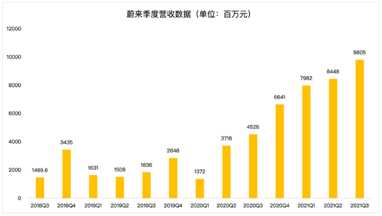 财报显示,蔚来汽车第三季度总营收为人民币98.053亿元,与去年同期相比增长116.6%,与上一季度相比增长16.1%,超过分析师预期的93亿元。