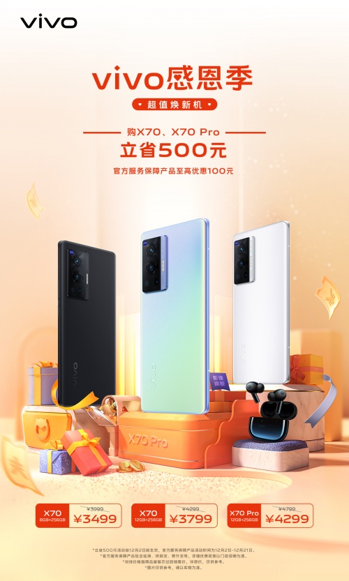为了满足消费者的需求,vivo于今日正式开启了“vivo感恩季,超值焕新机”主题活动。12月2日起,选购X70系列尊享两重礼:购买vivo X70、vivo X70 Pro所有版本立省500元;官方服务保障产品优惠购,提供延保、碎屏宝、意外宝等服务,至高优惠100元。从销售到售后,vivo给出了实打实的福利。