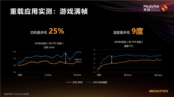 在面对更苛刻的重载应用,比如满帧运行MOBA游戏,天玑 9000的功耗和机温表现同样优秀。实测数据显示,天玑9000其相比2021年安卓旗舰,功耗最多低25%,温度最多低9°C。如此出众的能效与温度控制,意味着搭载天玑 9000的手机将有资本带来更高、更稳定的游戏帧率,以及更持久的游戏续航时间和良好的机身握持体验,想必将吸引众多游戏手机厂商关注。