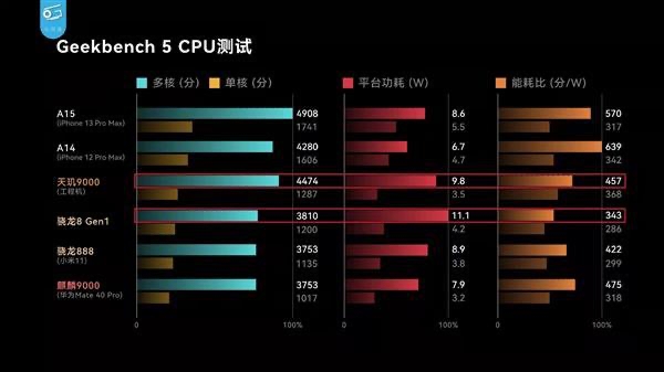 在GeekBench对CPU的测试中,天玑9000以4474的多核成绩实力碾压新骁龙8,多核功耗方面,天玑9000的功耗比新骁龙8低了11.7%。