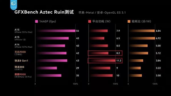 GFXBench对 GPU的测试中,天玑 9000的功耗比新骁龙8低了26.7%(图/网络)
