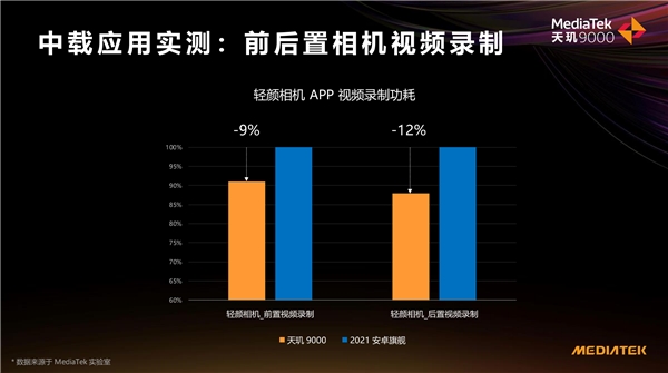 从联发科给出的数据看来,在轻载应用场景下,相比某2021年度旗舰,天玑 9000最多可节省多达38%的耗电。而在拍照、录像等中载场景下,则分别可节省9%和12%的耗电。整体来看,日常功耗表现相当出色。