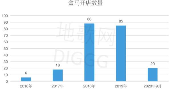 盒马2016年至2020年9月期间开店情况,地歌网制图