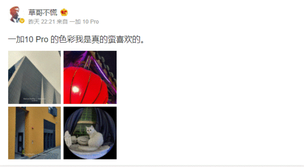 首先,根据微博网友@草哥不慌 的分享样张,我们可以看到,无论是白天拍摄的风景建筑还是夜晚色彩鲜艳的灯笼,一加 10 Pro的实拍样张个既能很好地保持着原本的色彩,整体画面相当纯净,极具氛围感。对此,这位网友也是直接了当地表示称,“一加 10 Pro的色彩我是真的蛮喜欢的”。而能有这般出色的色彩表现,自然是离不开哈苏影像系统2.0的帮助。