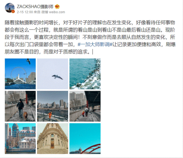 不仅如此,这次一加还邀请了三位哈苏大师为一加 10 Pro精心调试了大师人像、大师童话、大师风光三款不同风格的滤镜,助力用户在日常生活中轻松拍出大师风格的样张。这方面,同样也收获了多位摄影爱好者的高度认可。像是@ZACKSHAO摄影师 便表示称,“一加大师影调”让记录更加便捷和高效,刷爆朋友圈不是目的,而是对于质感的追求。