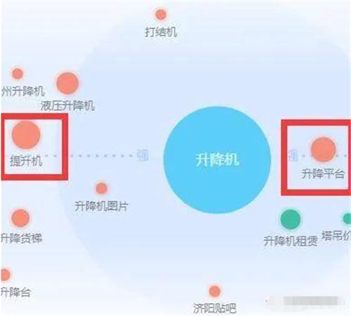 这是关于【升降机】这个词的需求图谱,讲到这里,很多人会问,需求图谱是什么意思?其实需求图谱也可以叫相关图谱,是关于某个词的相关词及相关度大小说明的一个图。