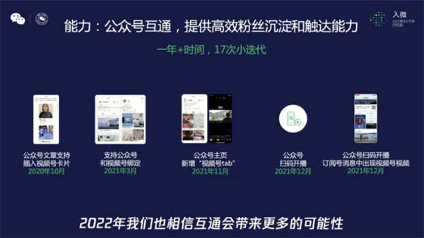 目前公众号团队全面支持视频号成长,比如在产品一体化、将更多的图文作者转成视频号博主等方面,今年的微信公开课上已经没有了公众号专题分享,同时服务号的产研维持现状不再做额外的投入。