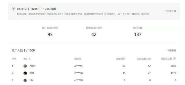 去年12月,视频号上线了直播预约推广功能,一场直播可以绑定 1000 个推广人。简单来说,用户可以通过扫码绑定成为直播推广人,在视频号后台也可以直接查看一场直播中,推广人带来的预约观众数、受邀人在直播间的交易金额。