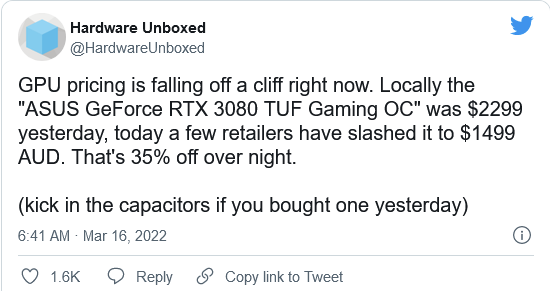 A5创业网(公众号:iadmin5)3月23日报道:近期的显卡报价雪崩,不同区域降价幅度也不同,据行内人士预估,显卡平均价格已经下降一成。其中,高端显卡 GeForce RTX 3080 TUF Gaming OC 的价格在澳洲市场一天内跌幅达到 35%,原先报价为 2299 澳元 ( 约 1 万元人民币 ) ,仅一个晚上就降至 1499 澳元 ( 约 7 千元人民币 ),创史上最大跌幅,其他规格显卡价格近期平均跌幅也达一成。
