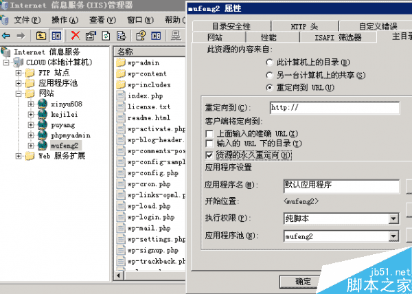 * 找到网站,点击属性,找到重定向到URL(U),