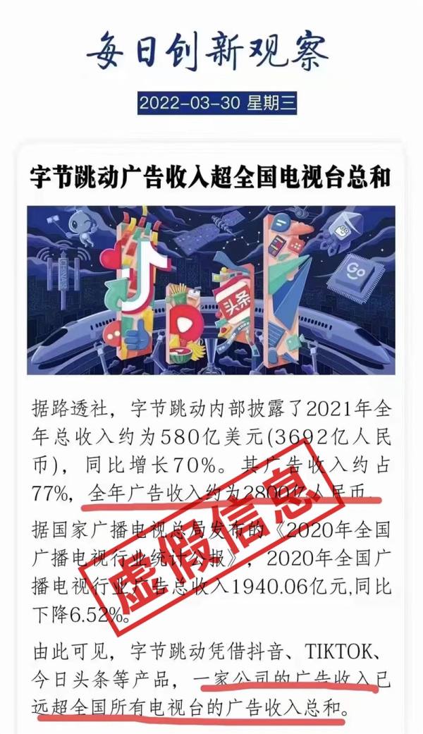 A5创业网(公众号:iadmin5)3月31日报道:昨日晚上,抖音发布了关于“字节跳动广告收入”相关谣言的说明。针对网传“字节跳动 2021 年广告收入 2800 亿,超全国电视台总和”消息。字节方面表示经查证,该消息系谣言。