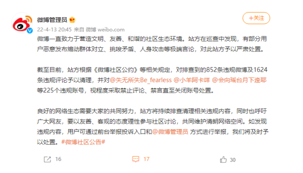 截至目前,站方根据《微博社区公约》等相关规定,对排查到的 852 条违规微博及 1624 条违规评论予以清理,并对 @失无所失 Be_fearless @小羊阿卡咩 @会向瑶台月下逢耶 等 225 个违规账号,视程度采取禁止评论、禁言直至关闭账号处置。