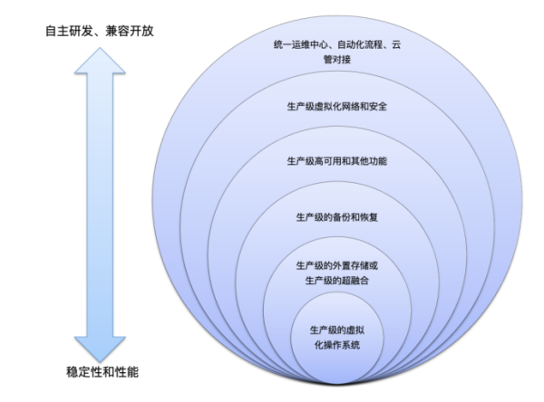 因此,首先要确定这两部分的替换方式和方法,尽量使得现有应用可以平滑迁移到新的虚拟化系统和存储上(Replatforming);再以新的虚拟化和存储为核心考察其他组件的替代产品,分阶段、分步骤完成所选全部产品组件在生产环境的集成。