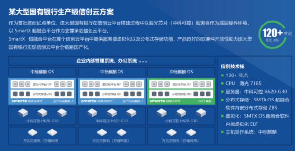 基于 SmartX 超融合的信创云基础设施解决方案,包含了虚拟化、分布式存储、网络与安全等核心组件,具备金融生产环境验证的“生产就绪”能力、核心组件的完全自主可控、充分适配及优化的信创生态、精简的架构与灵活的扩容,可帮助用户同时实现基础架构的云化转型和信创转型。