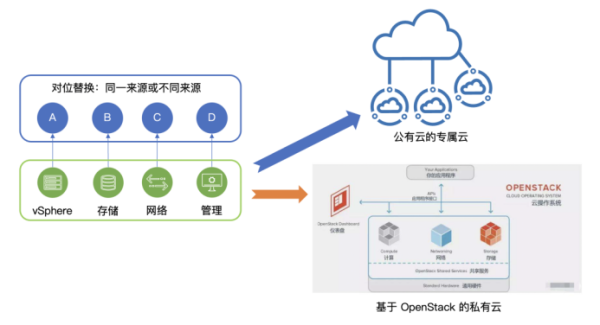 可能读者觉得上图太过复杂。这也正反映出对使用中的几种、十几种相关软硬件进行逐一评估和替换操作的难度。如果换一个思路,不是在组件级进行逐一替换,而是采用私有云或专属云方式整体替换现有 VMware 环境,也是应当被考虑的方式。那就不仅仅是对基础设施层进行重建(Replatforming)了,还需要做应用和数据的迁移,很大可能需要重构应用(Rearchitecting)。