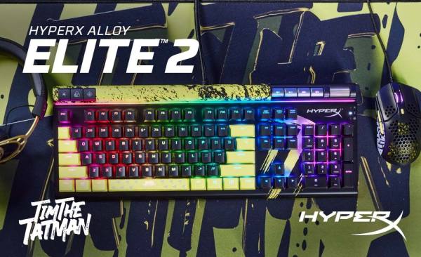 HyperX Alloy Elite 2 阿洛伊精英2游戏机械键盘: HyperX Alloy Elite 2阿洛伊精英2游戏机械键盘是一款为游戏玩家、主播以及对键盘有较高要求的用户而打造的产品。这款限定版键盘在设计时参考了TimTheTatMan独具特色的个人风格,键盘上拥有飞溅的写意图案,控制键还采用了黄色的键帽,,同时保留了原键盘的各项特色功能,包括专用的媒体键和大尺寸音量滚轮。HyperX Alloy Elite 2阿洛伊精英2不仅是一把功能齐备的游戏机械键盘,它还适用于视频剪辑等各类多媒体内容的整理和编辑。这款键盘采用高品质和高可靠性的HyperX自主键轴,拥有独特光带设计,可带来明亮耀眼的动态RGB灯效。此外,玩家还可以通过HyperX NGENUITY软件自定义键盘的灯光效果和设定宏功能。