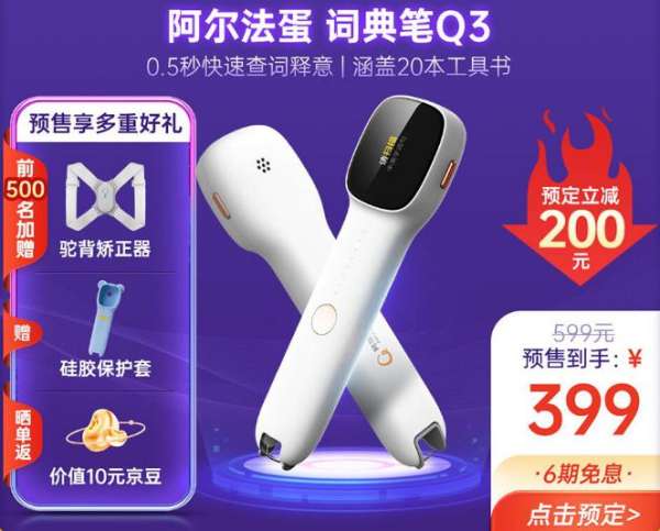在5月23日、5月26日,京东、天猫分别开启618预售的同时,阿尔法蛋京东自营店、阿尔法蛋天猫旗舰店同步开启预售。预售时间内付定金可以享受立减优惠,最高立减200元,例如高性价比词典笔Q3低至399元即可带回家。因此,家长们记好预售时间是关键!阿尔法蛋天猫旗舰店付定金时间5月26日20点-5月31日18点,京东自营旗舰店付定金时间5月23日20点-5月31日19点。