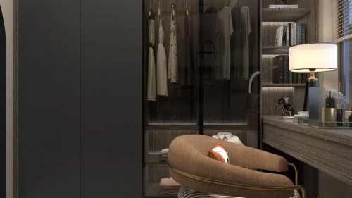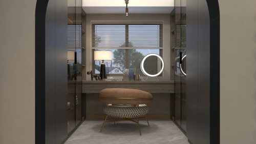 清晨,太阳还没走过屋顶,早起的鸟儿就已经出没在卧室窗前的银杏树上,等待第一支,混合阳光、泥土、花香的晨曲,许多的梦,将被这些欢悦的合声唤醒。当阳光穿窗而过,投射在衣帽间的小吧台上,灰橡木色的纹理愈发清晰起来,用疏朗的线条为画笔,描绘美好生活的轮廓。有屋智能设计师在卧室分割出衣帽间,并在此设置的独立吧台,既可以作为工作区,又可以化身为梳妆台,一方小小天地,让你尝试扮演不同的角色。超哑深灰的衣柜门板用玻璃进行调和,藏与露中,展示出设计本身的自信,诠释着空间的奢感。