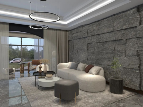 有屋智能设计师大胆的将仿石搬到室内作为沙发背景墙,石质的不规则凹凸感,让人彷佛置身于海边崖壁下,粗犷野性的设计手法之中,蕴含着舒适与慵懒。同时以白色鹅卵石状沙发的圆润线条中和了背景墙的凌厉,一张一弛中,达到了空间秩序的平衡。坐卧于沙发之上,犹如置身于海边的鹅卵石中,海风佛面,海浪的声音由远及近,拍打着陡峭崖壁,这一刻,只需静静聆听空间与自然之间温文尔雅的对话。