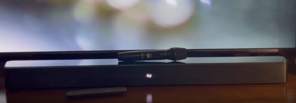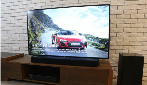 B5856整体由条形音箱和低音炮组成,构成中规中矩,条形音箱采用了梯形几何状设计,正面是蜂窝网罩,两侧轮廓采取了圆润过渡设计,搭配笔者55寸的小米电视相得益彰,可以轻松和电视融为一体,不会影响家居格调。