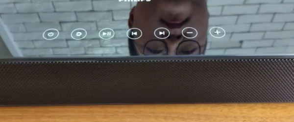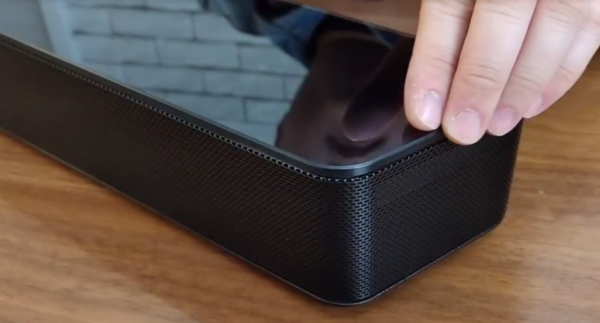 除轮廓鲜明的特点外,条形音箱的顶部还采取了镜面设计,这也是笔者比较喜欢的部分,深色镜面有光影反射,镜面搭配低调奢华的黑色,回音壁显得更时尚、精致。中间几个简单的按键,简单易懂,包括开关机、播放暂停和音量等功能,家里有老人或孩子的,也可以轻松操作。