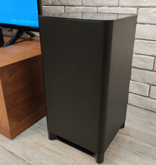B5856的低音炮整体尺寸偏大,和小一圈的电脑主机差不多大小了,100W的独立输出功率可以带来强劲的低音,唱歌有更好的效果,平时用来看电影、听音乐也有不错的声音表现。在我们看不到的低音炮底部还有一个圆锥状的反射器,用于低音增强,同时家里铺地毯的,这样的设计可以有效防止共振,可以说为居家K歌的设计十分周到。