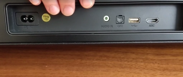 背后是隐藏式的接口处,含电源接口、模拟音频输入口、光纤音频接口、USB2.0接口和HDMI ARC接口,用HDMI ARC接口连接笔者的电视,线缆接口很隐蔽,不需要多余的布线也不会影响客厅美观。