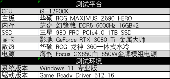 本次测试平台处理器采用英特尔酷睿i9-12900K搭配ROGMAXIMUS Z690 HERO主板,CPU在游戏时间睿频至5.0GHz左右;内存采用芝奇幻锋戟 DDR56000Hz 16GB*2;固态采用的是PCIe4.0固态,性能比PCIe3.0的固态读写速度更快;散热是华硕 ROG 龙神 360一体式水冷,强大的散热性能能够让CPU发挥出稳定的性能;最后电源是海韵 Focus GX850白 850W金牌模组电源,这套配置可以让影驰GeForce RTX 3080 Ti 金属大师显卡稳定发挥出其应有的超强性能!