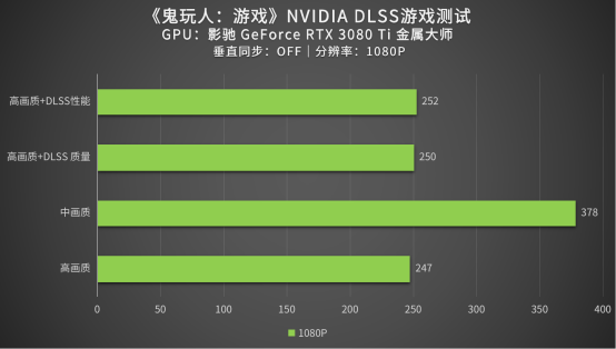 最后在1080P的分辨率下,未开启DLSS技术的情况下,最高这帧率可以达到378的帧率表现,可以说就是开挂般的性能存在,在开启DLSS技术后,最高帧率可达252针,可见影驰GeForce RTX 3080 Ti 金属大师的性能强悍之处。