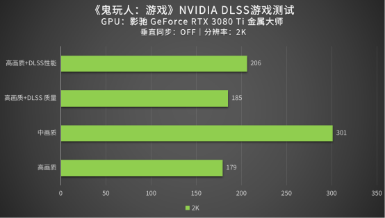 而在2K分辨率下,在关闭DLSS技术情况下,影驰GeForce RTX 3080 Ti 金属大师显卡依然可以轻松跑到301帧的成绩,而开启DLSS技术后,帧数最多可以涨到206帧可以体验高画质来带的欢快感。
