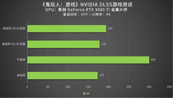 在4K分辨率的情况下,未开启DLSS最高也能达到300帧的成绩,而开启了DLSS技术后,最高可达到194帧,要知道4K分辨率最高画质加上所带来的画面体验也是非常优秀的,影驰GeForce RTX 3080 Ti 金属大师+NVIDIA DLSS能够让游戏体验更上一层楼