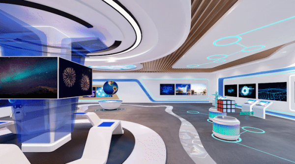在视觉呈现及布展技术支持方面,视创云展2.0采用3D空间设计与全景相机拍摄结合,通过AI重绘场景模型,3DMAX设计场景、渲染全景图,使用WebGL将全景图绘制到场景模型上,让场景既有三维空间立体距离感,又能够在不安装任何插件及软件的基础上在Web端、手机端进行跨平台展示。