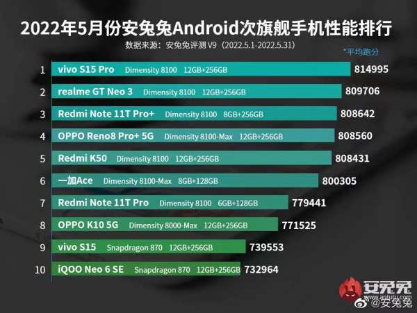 同时,在5月安卓次旗舰手机性能榜单中,vivo S15 Pro、realme GT Neo 3、Redmi Note 11T Pro+、OPPO Reno8 Pro+、Redmi K50、一加Ace、Redmi Note11T Pro、OPPO K10这八款搭载天玑8000系列芯片的手机性能包揽榜单前八,天玑8000系列芯片成功“屠榜”。