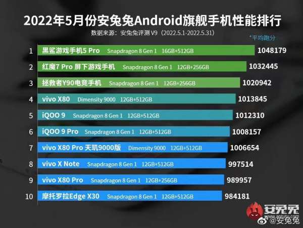 2022年上半年的手机市场十分精彩,很大原因在于天玑9000和天玑8000系列的出现,让手机厂商多出了更好的选择。安兔兔安卓手机性能榜单也证明了这一点。最近,安兔兔发布了5月安卓手机性能排行, vivo X80平均跑分为1013845,稳居第四名,vivo X80 Pro天玑9000版也获得超百万跑分成绩,位列榜单第七名。这两款手机都搭载天玑9000芯片。