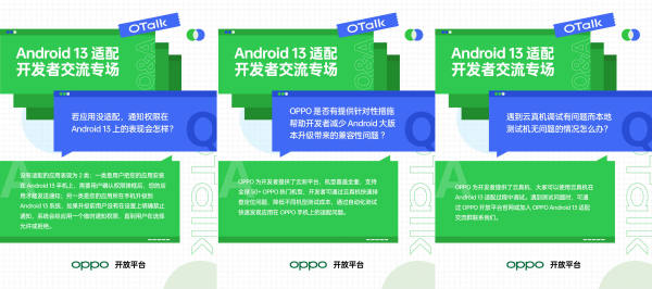 本次「OTalk」适配交流活动以线上直播形式开展,近距离倾听开发者最真实的声音。活动中,OPPO 高级工程师全面讲解了 Android 13 新特性,介绍了 OPPO 提供的适配支持,还进一步针对开发者的适配共性问题进行解答,让开发者的适配工作更加省心省力。