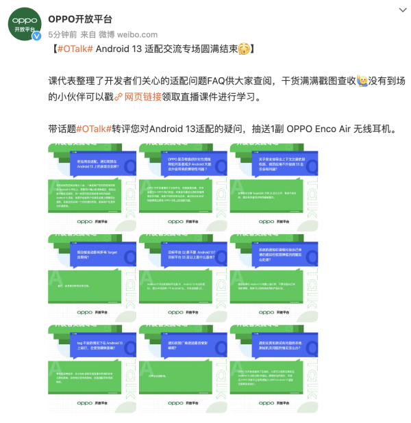 继 Android 13 Beta 2 在谷歌 I/O 大会亮相后, 基本达到“平台稳定”的 Beta 3 版本也于 6 月 8 日正式发布。OPPO 作为国内安卓新版本适配“第一梯队”的手机厂商,不仅首批推出 Android 13 开发者预览版,提供多项适配支持,还于 6 月 8 日举办了「OTalk」Android 13 适配开发者交流专场活动。多位 OPPO 高级工程师与开发者在线互动,针对版本问题深度交流,推进适配工作高效进行。