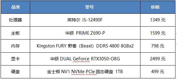 英特尔针对中国市场推出的小黑盒酷睿i5-12490F,6核心,12线程,20MB L3缓存,睿频最高4.6GHz,PCIe 5.0至高可达16通道,并支持DDR5内存。虽然搭配B660主板可以拥有更好的性价比,但是考虑当前B660主板基本都是支持DDR4内存,并且未来可升级型有限,选择支持DDR5内存的Z690更为明智,毕竟DDR5内存起始速度就高达4800MT/s,性能更出众。主板选择了华硕的PRIME Z690-P,支持LGA1700插槽,支持12代英特尔酷睿处理器,14+1DrMOS供电模组,支持4条DDR5内存,3组M.2接口。