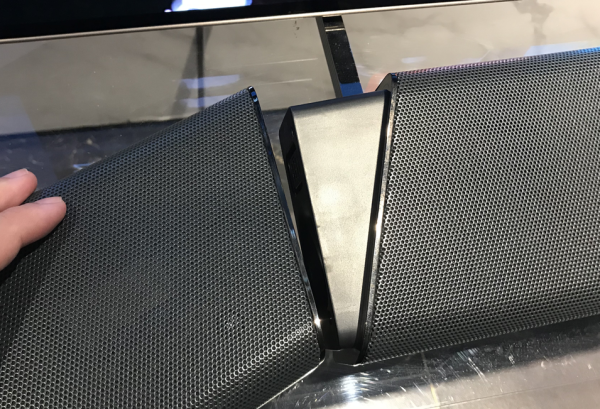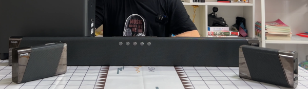 很多人在测评回音壁时喜欢从回音壁主体讲起,但拿笔者手上的 B97而言,最大的亮点一定是下面这两个环绕音箱上。可拆卸的环绕音箱像变形金刚一样,可以组装变形为一体化的条形音箱,放在主体两边,即可以充电,也不影响美观性。也可以拆下来,构成随需环绕的真实立体声设备。