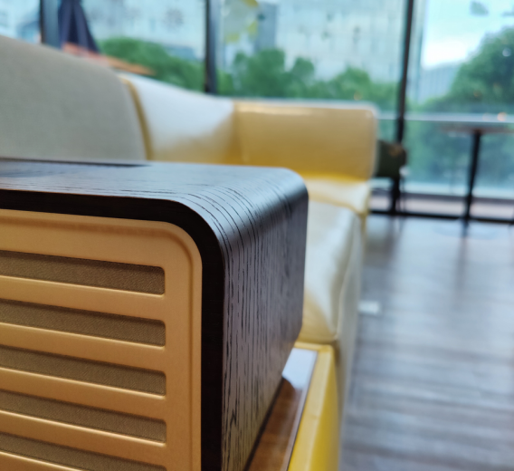 △音响整体是木质结构,保留了原木木纹,纹理自然、清晰,手感上乘,很有质感。