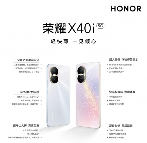 7月13日,荣耀X40i正式亮相,并在全渠道开启预约。作为荣耀XNi系列的第二款手机,荣耀X40i拥有7.43mm超薄全面屏、40W超级快充和5000万像素高清影像,同时外观设计辨识度拉满,或是档位最轻薄大屏大内存手机。